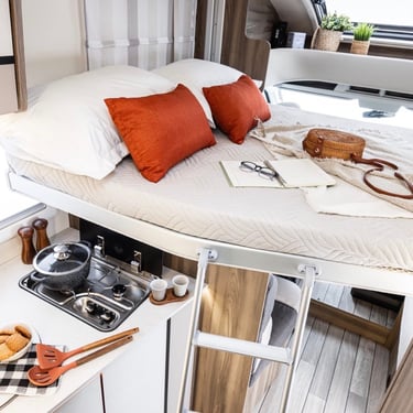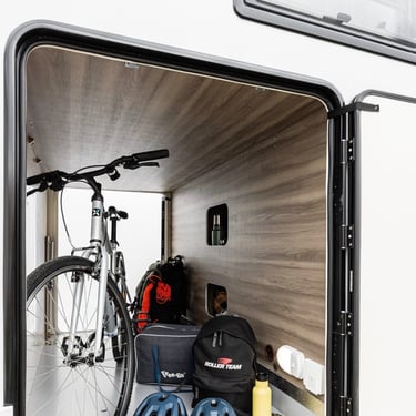 El interior combina una zona de estar luminosa, cocina equipada, baño completo y amplios espacios de almacenamiento, incluyendo un garaje trasero de gran capacidad, pensado para transportar equipaje y equipamiento de viaje con total comodidad.